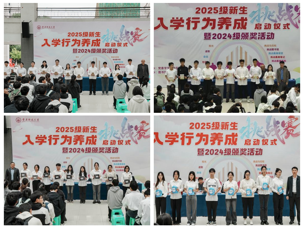 11月5日中午,2025级新生入学行为养成挑战赛启动仪式暨2024级颁奖活动在教学主楼大厅举行。党委学生工作部(党委武装部、学生处)、图书馆(档案馆、校史馆)、体育部相关负责人,2024级全体获奖学生及2025级新生代表参加仪式。活动由党委学生工作部副部长罗庆洪主持。